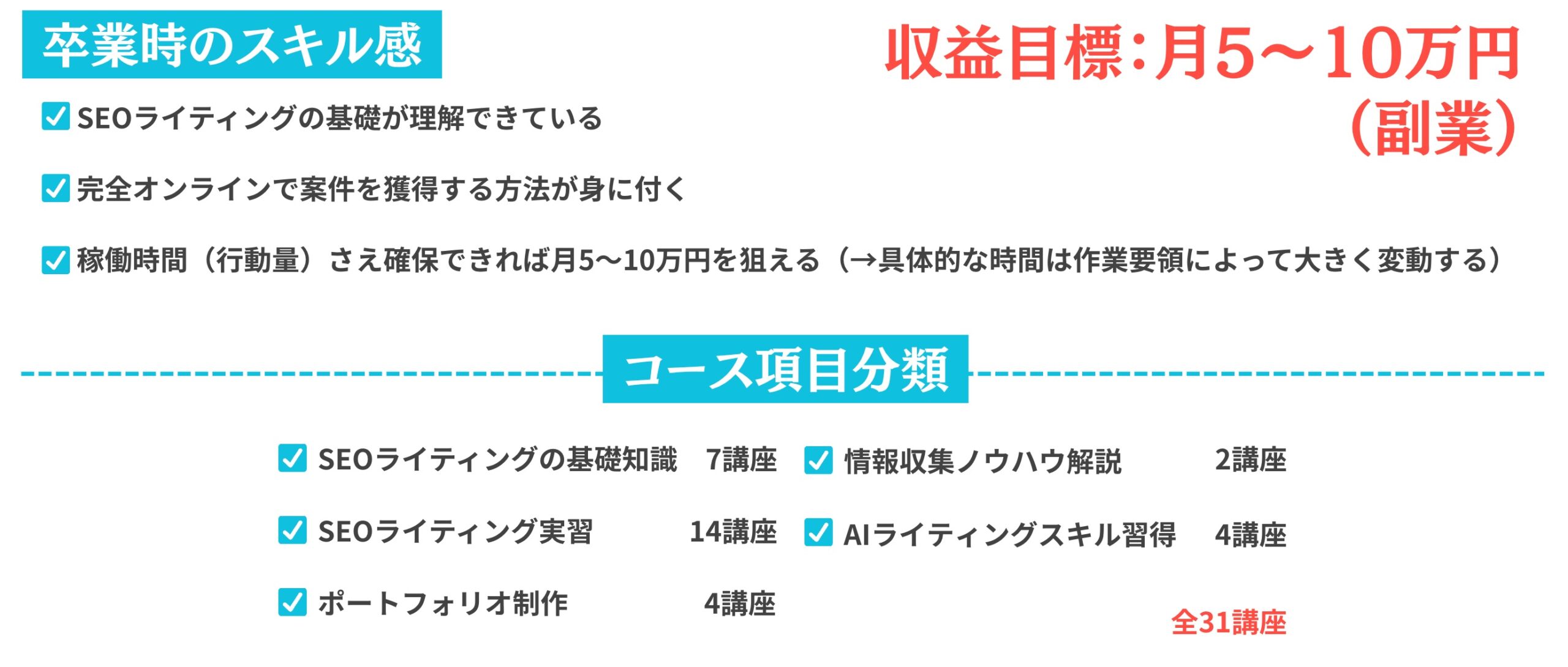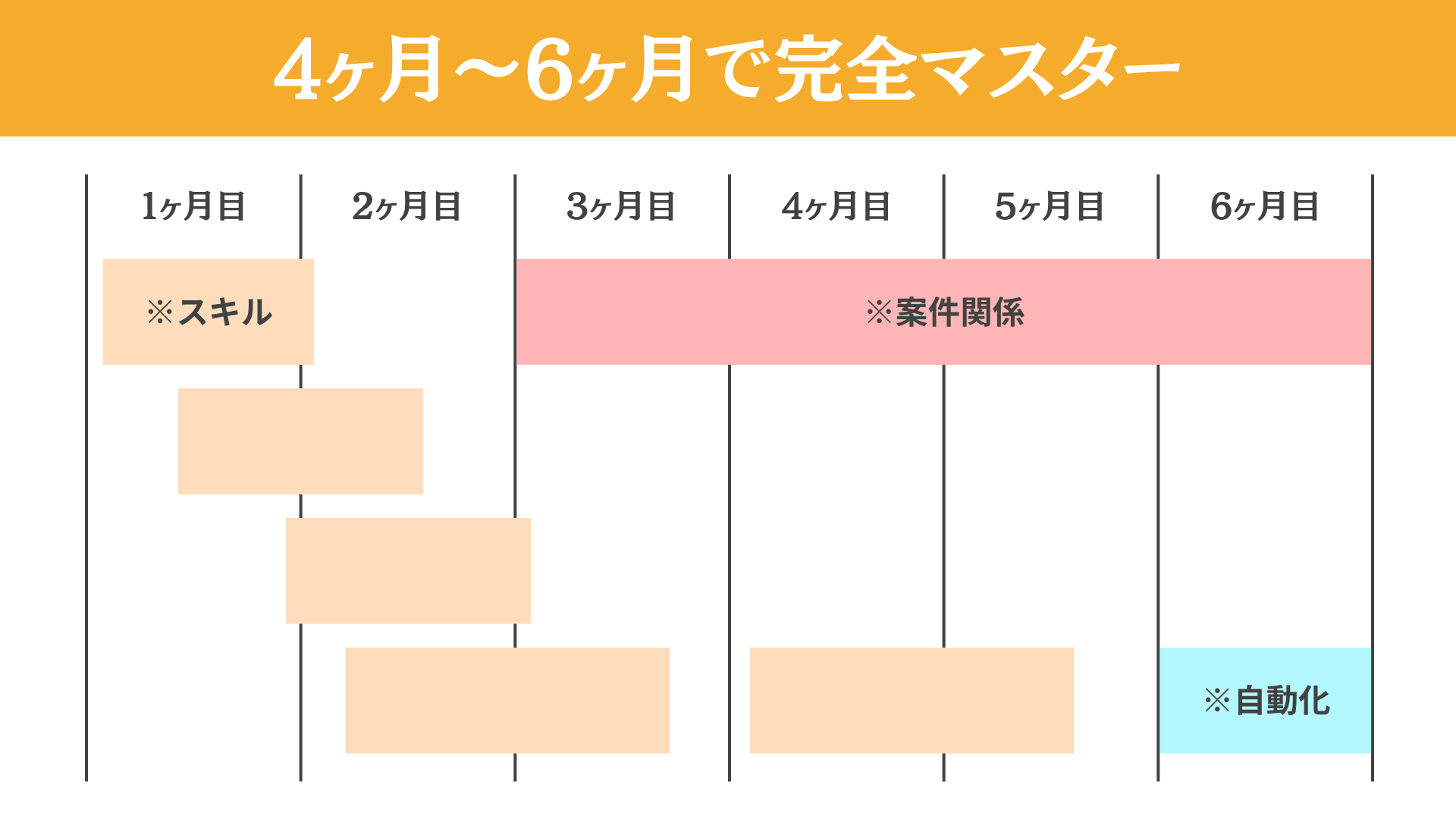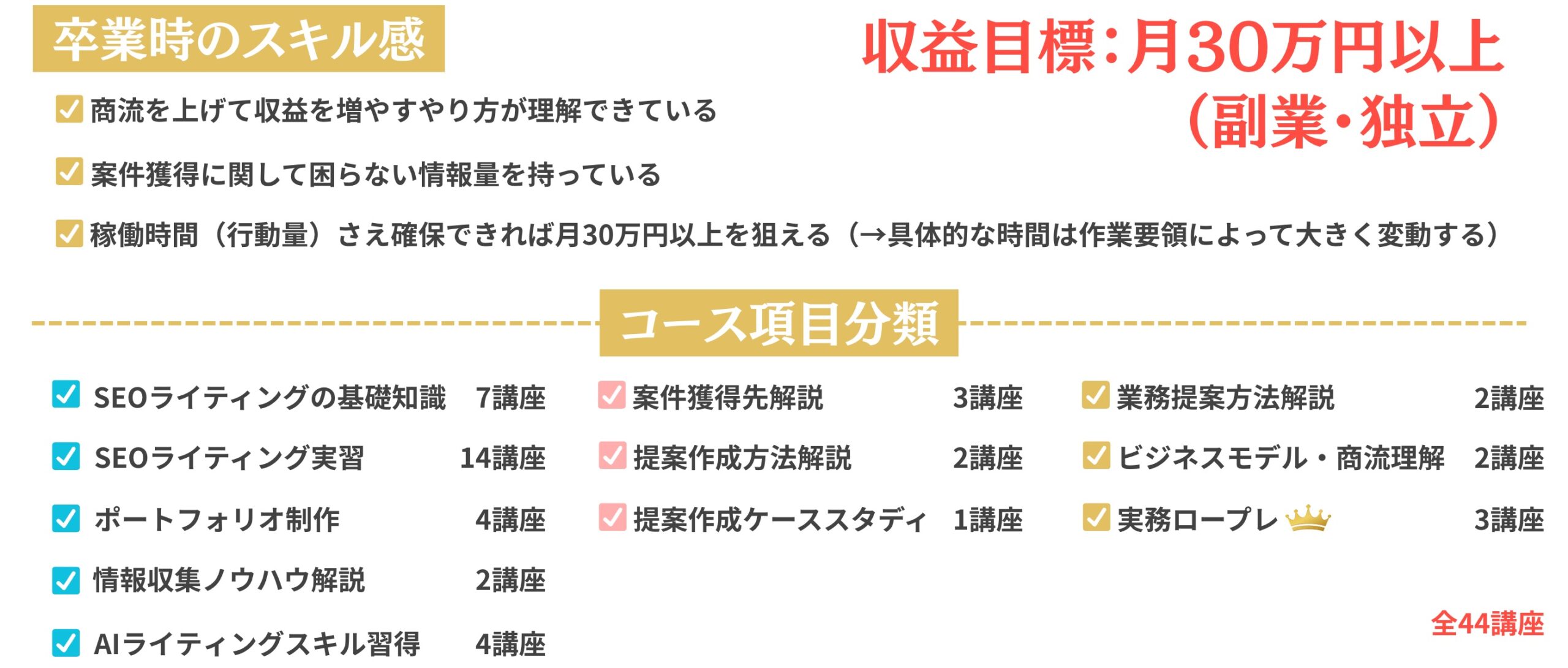 ビジネスの土台となるライティングとセールススキルを学んでいき、4ヶ月~6ヶ月でまずは副業レベルで3万〜30万を安定して得たい方向けとなります。