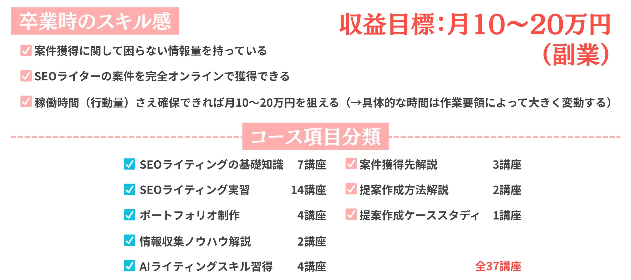 ビジネスの土台となるライティングとセールススキルを学んでいき、4ヶ月~6ヶ月でまずは副業レベルで3万〜30万を安定して得たい方向けとなります。